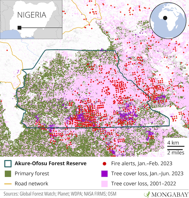 Tovább komplikálják a dolgot az erdőtüzek, melyeket azért gyújtanak, hogy az új farmok számára lecsupaszítsák a területet vagy hogy a már meglévők határait tágítsák. A rezervátumban élő farmerek 2021-ben elmondták a Mongabay-nek, hogy ezek a tüzek gyakran irányíthatatlanok és nehéz – ha nem lehetetlen – őket megfékezni, mivel nincs képzett tűzoltógárda és tűzoltásra alkalmas felszerelés. A NASA műholdképes adatai azt mutatják, hogy a tűzriadók 2023 első néhány hónapjában az Akure-Ofosu egyik felére koncentrálódtak.