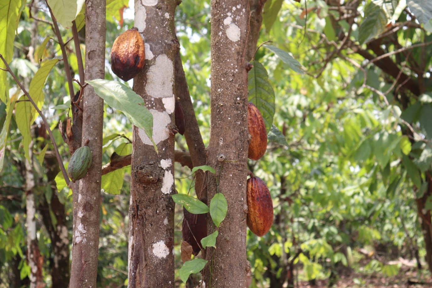 2021-ben, amikor a Mongabay terepszemlézett az Akure-Ofosu-ban, zöld felhőkként burjánzó kakaófarmok pettyezték a tájat – a farmokat jelzések és ösvények választották el az egykor hatalmas erdő maradványaitól.