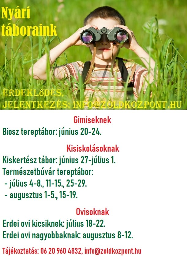 Árak: erdei ovis és kiskertész tábor 25.000,-Ft/gyermek, tereptáborok 35.000,- Ft/gyermek.