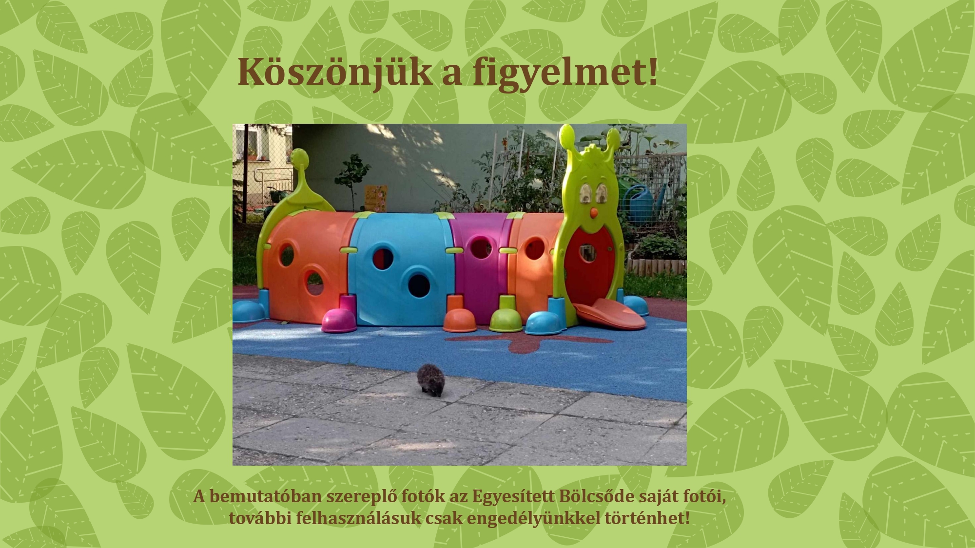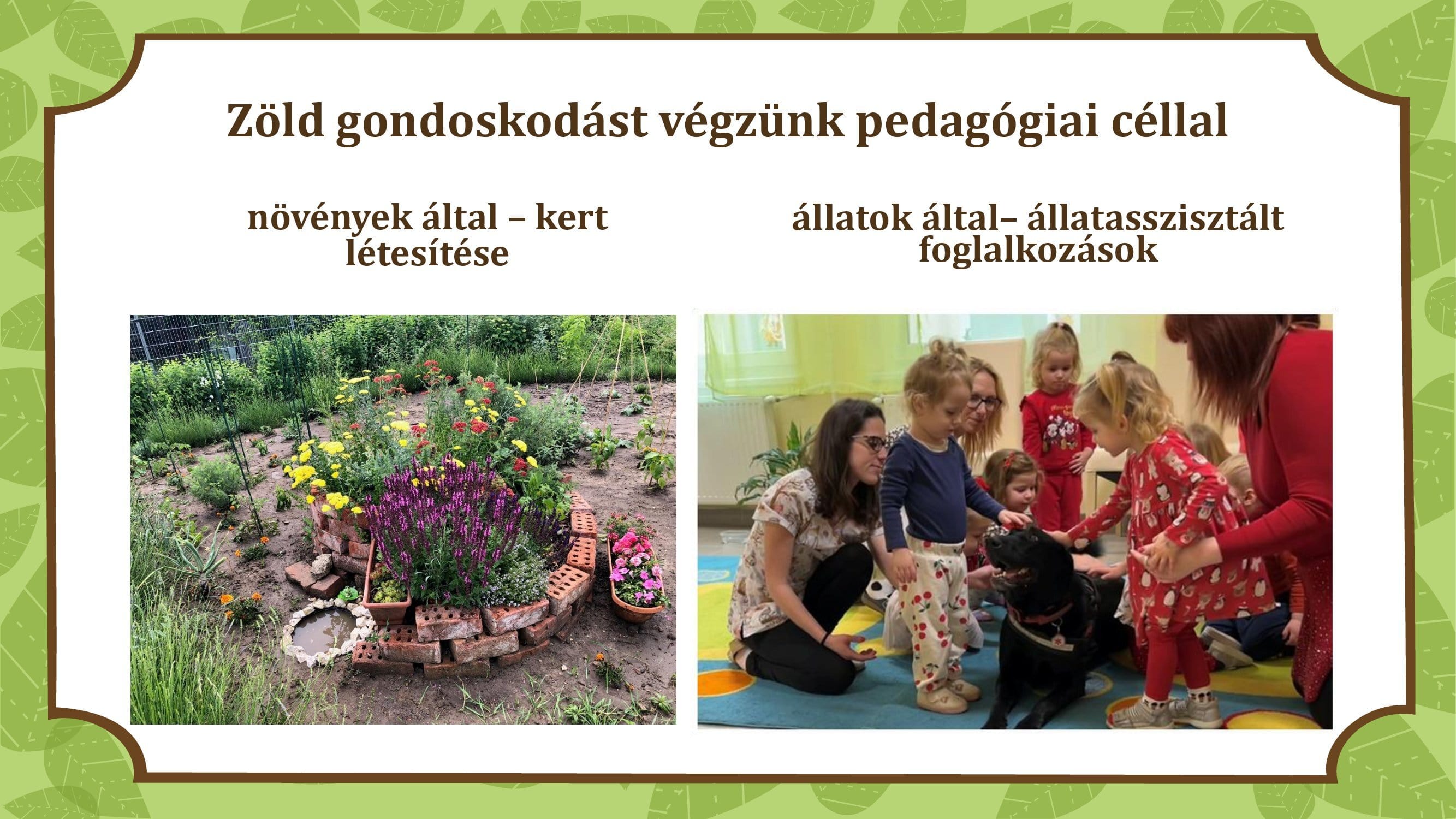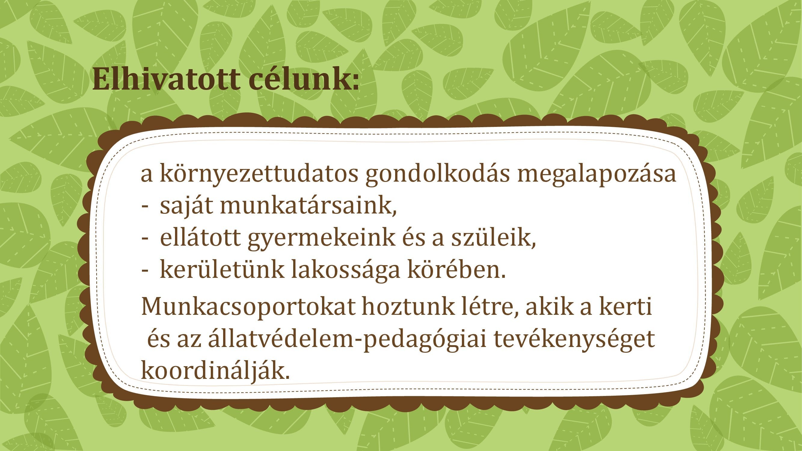 Az Egyesített Bölcsőde Budafok-Tétény Budapest XXII. kerületében 98. éve biztosítja a három éven aluli kisgyermekek napközbeni bölcsődei ellátását. „Zöld gondoskodásunk” részeként a növényeken kívül az állatokat is bevonjuk a pedagógiai folyamatokba, tisztelettel vagyunk irántuk.