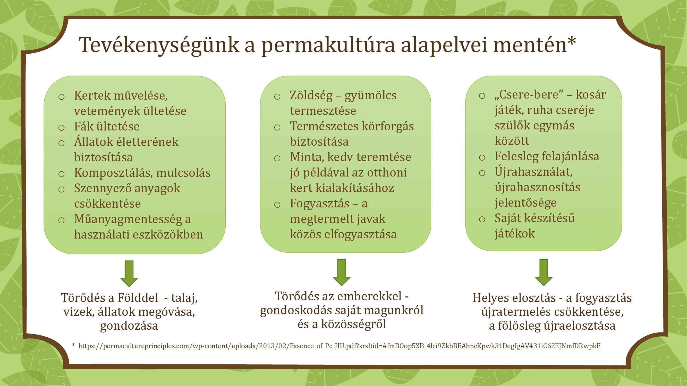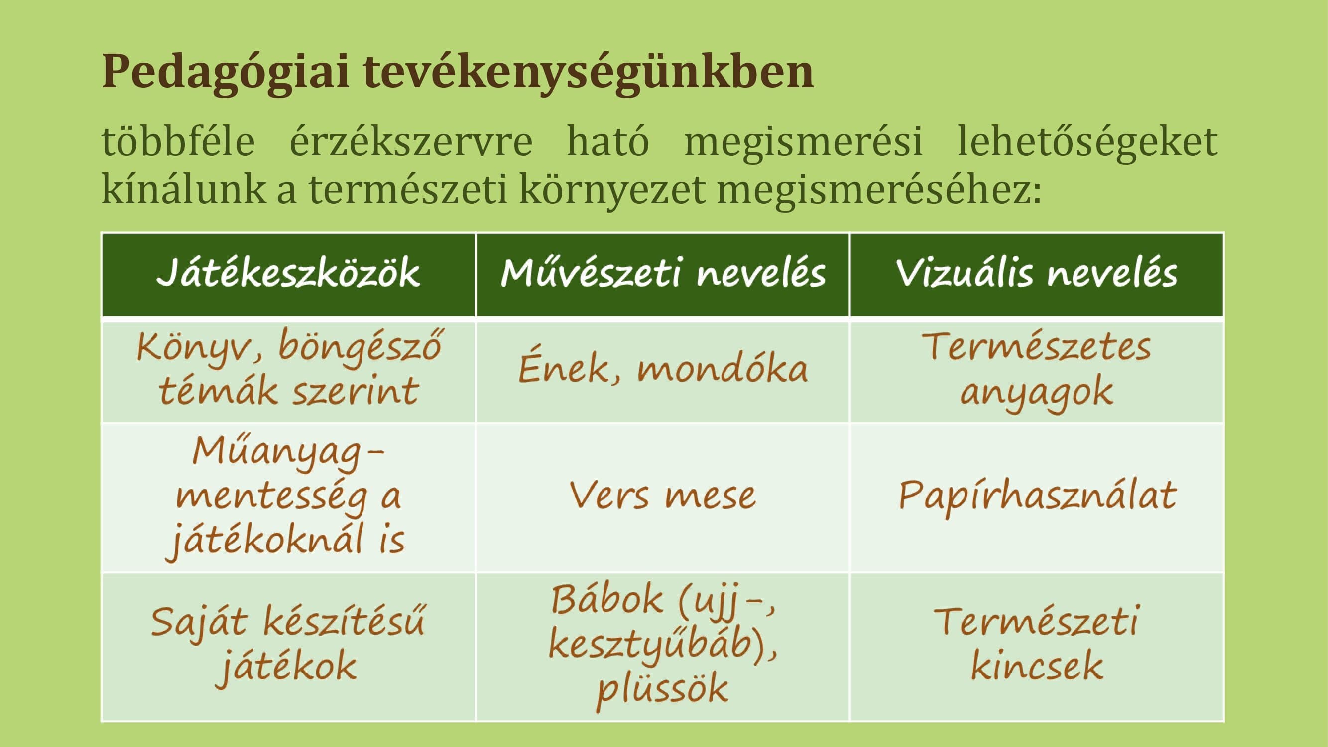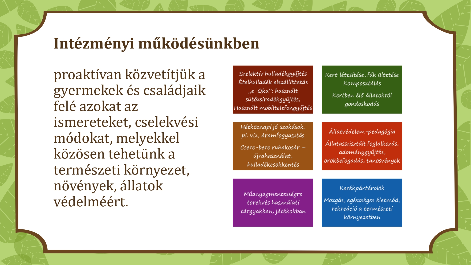 Saját, bölcsődei nevelés területén végzett pedagógiai tevékenységünk lehetőségeivel élve erőfeszítéseket teszünk mind az állatfajok fennmaradásáért, mind az egyes egyedek jóllétéért a biodiverzitás megvalósulása érdekében azzal, hogy bölcsődei környezetünkben igyekszünk megteremteni a körülöttünk élő állatok életének feltételeit.