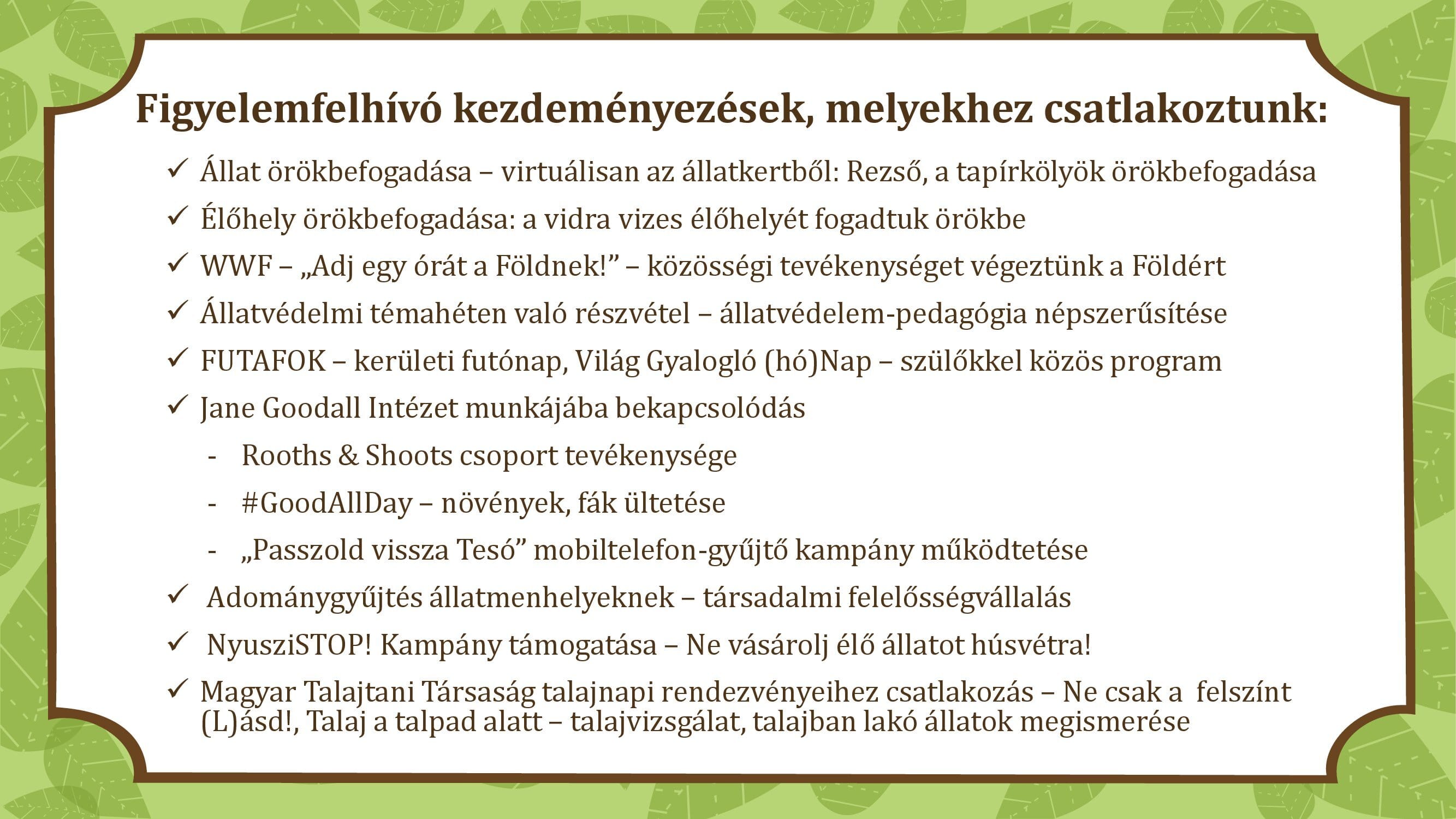 Proaktívan közvetítjük azokat az ismereteket és cselekvési módokat a gyermekek és családjaik felé, melyekkel közösen tehetünk az állatok védelméért.