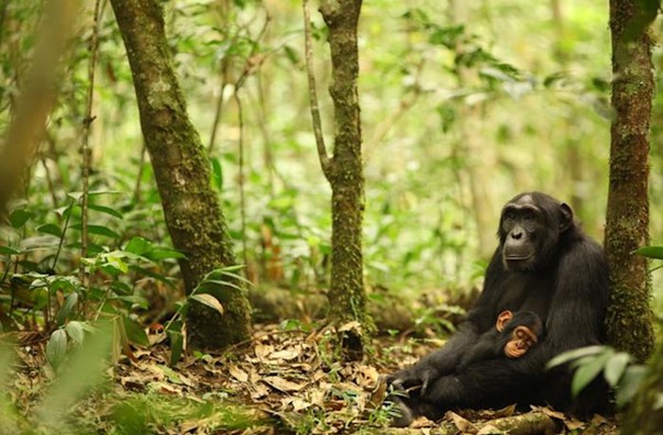 Csimpánzanya a kölykével Ugandában (Kép: Kevin Langergraber/The Ngogo Chimpanzee Project)