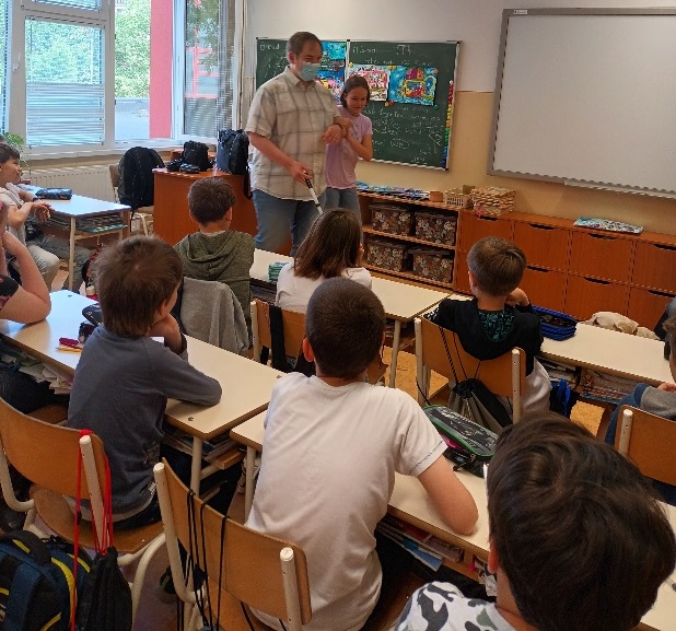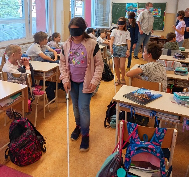 Gyuri bácsi elmesélte a gyerekeknek, mit kell tenniük, ha egy vak emberrel találkozunk, hogyan kell átkísérniük a zebrán. Majd a vállalkozók a vakok bőrébe bújhattak, és kipróbálhatták a fehérbottal való közlekedést.