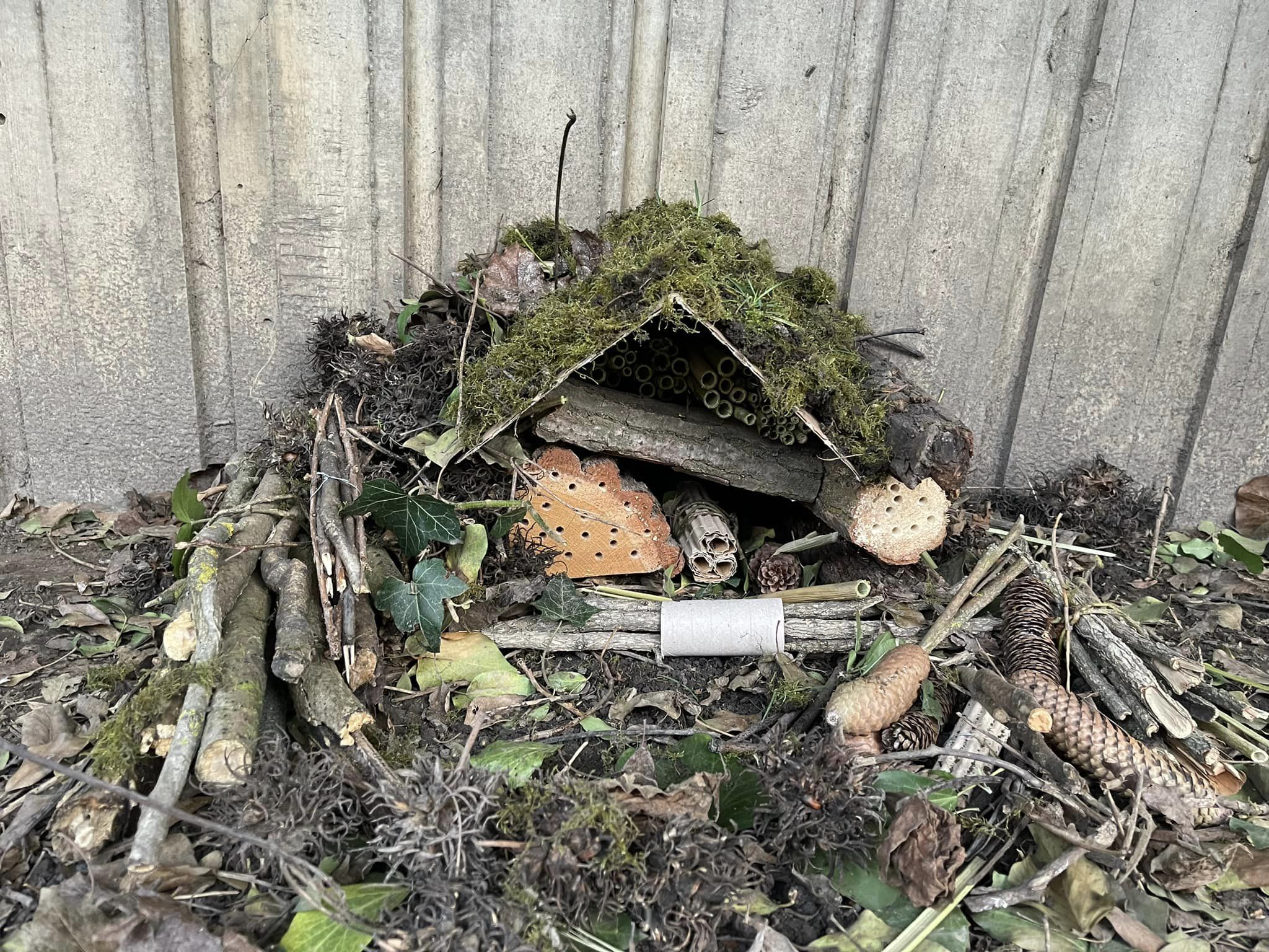 A könyvtár belső udvara lehetőséget ad a madár- és rovarvédelemre, a virágágyások gyógynövénykert létrehozására. Készítettünk egy amatőr rovarhotelt a gyerekekkel, amit bővíteni szeretnénk.