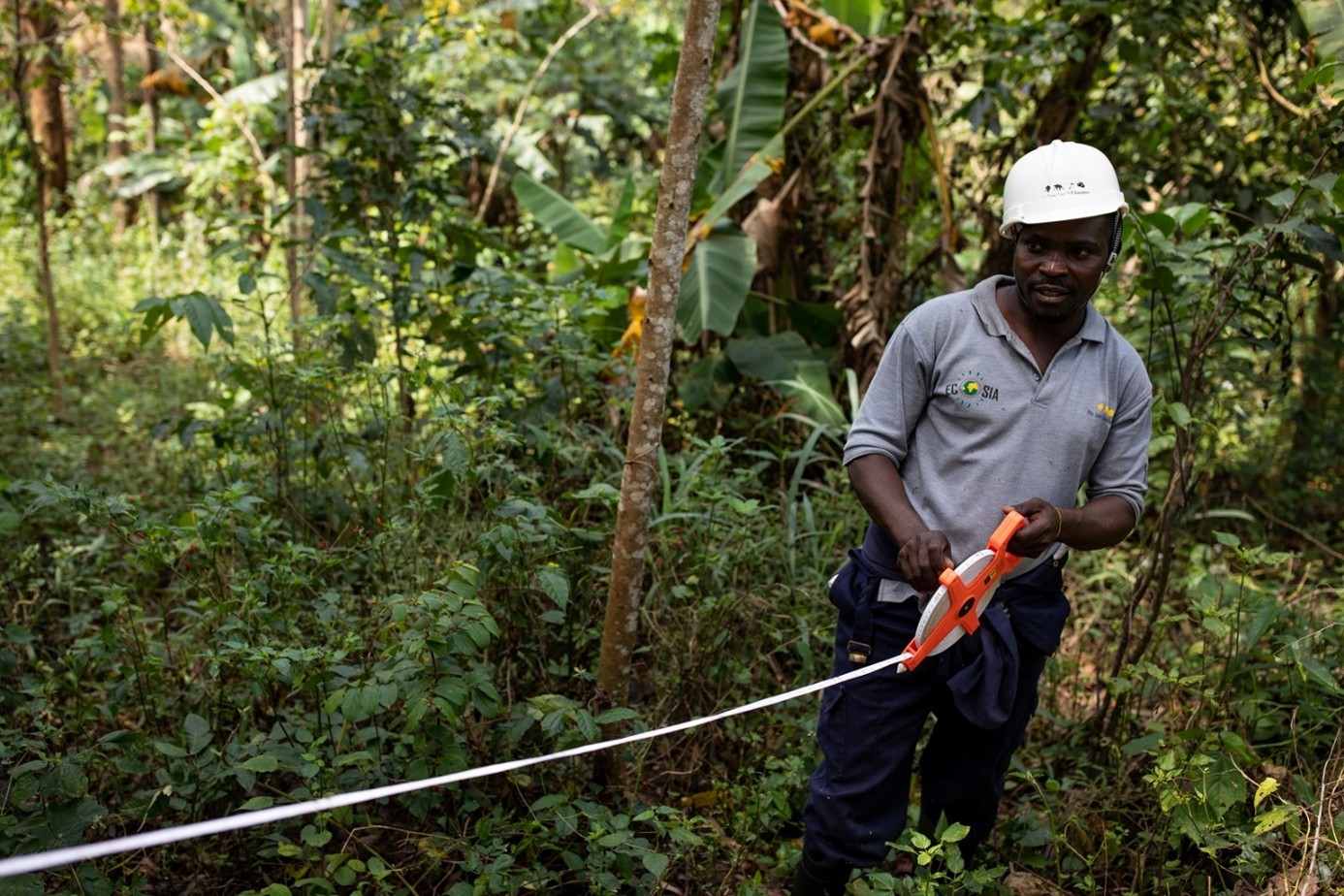 Fák átmérőjének mérése a Budongo-Bugoma zöldfolyosónál, Ugandában. A terepi felméréseket regionális központok, általában botanikus kertek szakértői végzik, akik rendelkeznek a szükséges taxonómiai ismeretekkel az őshonos és egzotikus fajok pontos beazonosításához. Kép: Luke Dray.