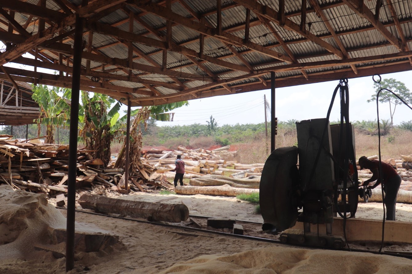 Munkások dolgozzák fel a faanyagot egy fűrésztelepen a délnyugat-nigériai Akure-Ofosu Erdőrezervátum közelében.