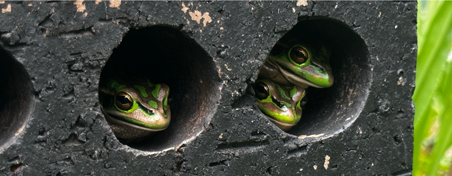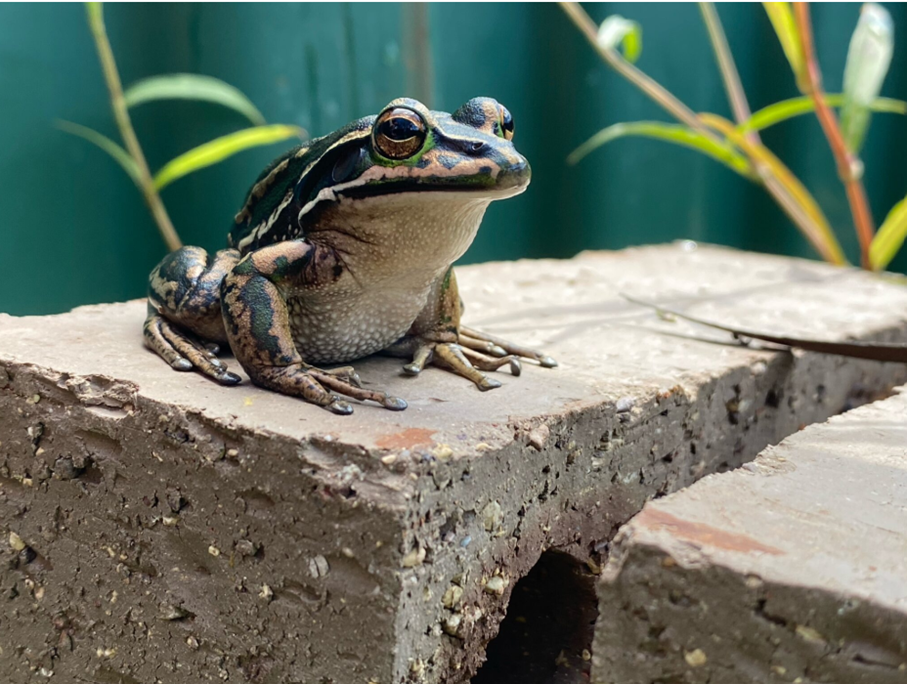 Felnőtt arany-zöld harangozóbéka (Litoria aurea) egy téglán a szaunakamrákban. A fotót Anthony Waddle készítette.