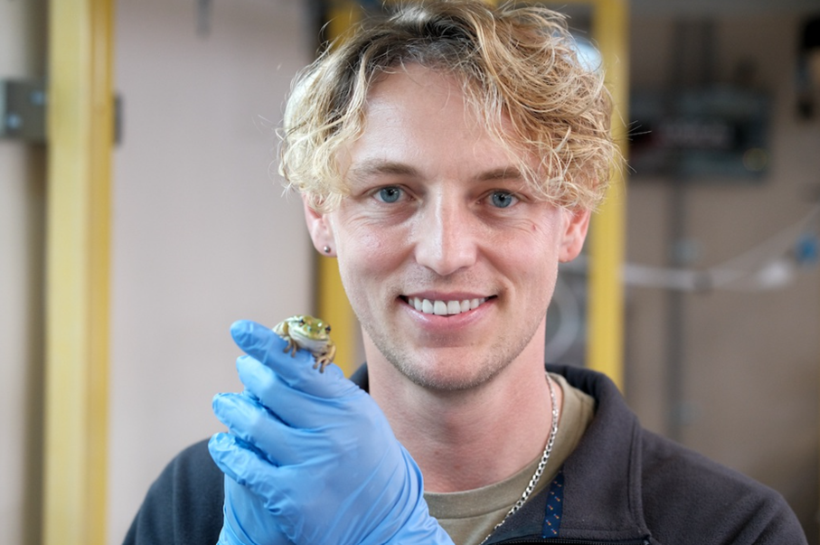 Dr. Anthony Waddle egy arany-zöld harangozóbékát (Litoria aurea) tart a kezében. Csapata békaszaunákat fejlesztett ki, hogy segítsen a békáknak leküzdeni a chytrid gombát. A fotót Yorick Lambreghts készítette.