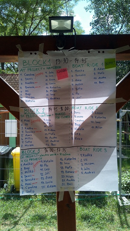 A sok új információtól megéhezve jól esett a vegetáriánus ebéd a táborba visszatérve. Utána viszont nem sokat pihentünk: hogy az időbeli lemaradást behozzuk, csoportbontásban megbeszéltük a fiatalok saját, lassan célegyenesbe forduló Roots & Shoots projektjeit. A bécsi csoport mohából készült, messziről olvasható CONCRETE (BETON) installációval szeretné felhívni a figyelmet az osztrák főváros szerintük egyik legnagyobb problémájára, a rengeteg beton felületre. A szlovákok egy elhanyagolt városi játszótérből varázsolnának közösségi összefogással a pihenést, közösségformálást és a biológiai sokféleség megőrzését szolgáló közösségi teret. A cseh fiatalok “Board for climate” programja fizikai installáción keresztül, míg az osztrák csapat digitális alkalmazásként megjelenő tudástárral segíti majd a klímahelyzet megértését, és ad tanácsot az egyéni ökológiai lábnyom csökkentésére. A jól szervezett műhelymunka lehetőséget adott arra, hogy kérdéseinkkel, ötleteinkkel mi is segítsük a remélhetőleg hamarosan bekövetkező sikeres megvalósítást.