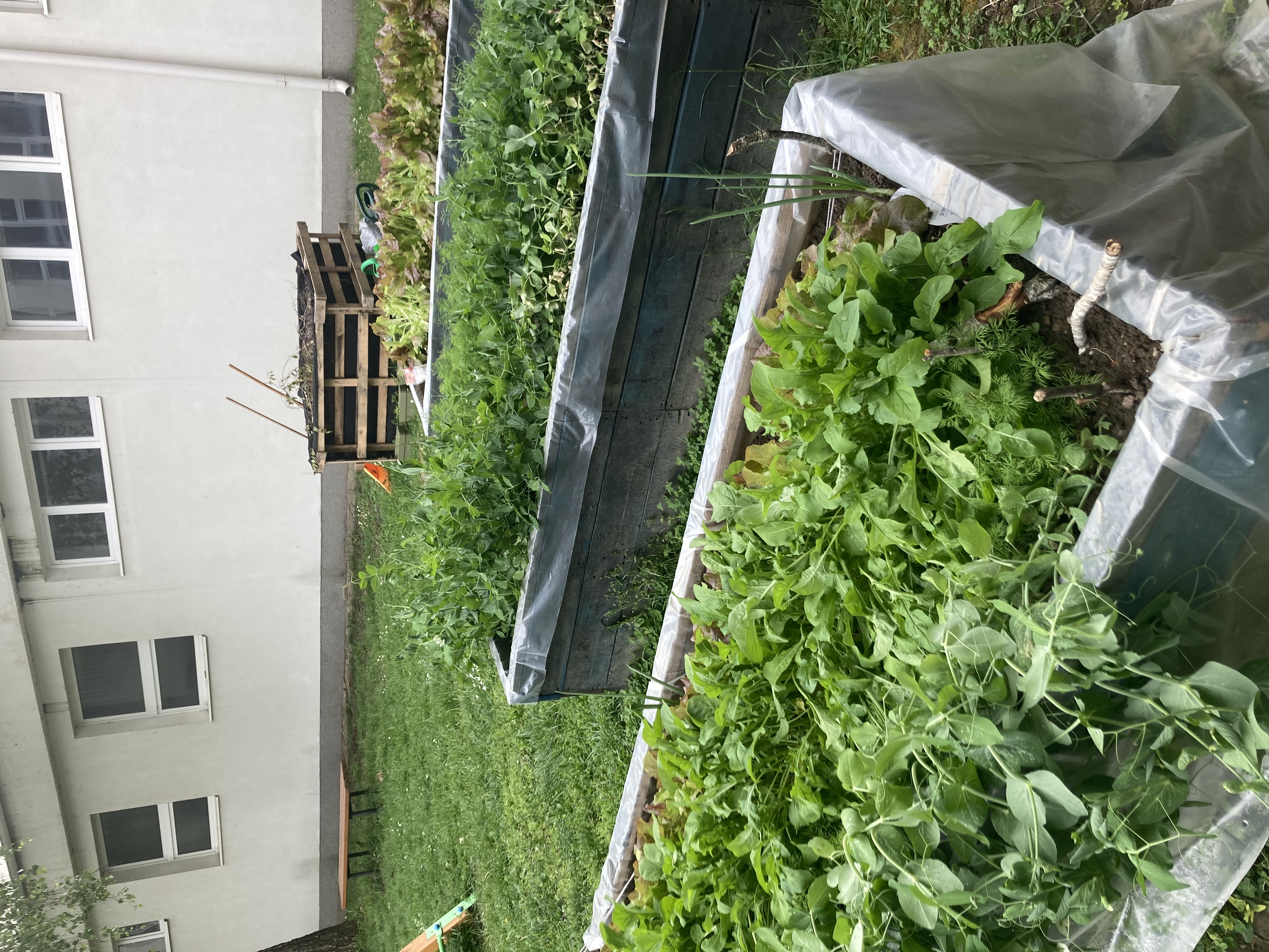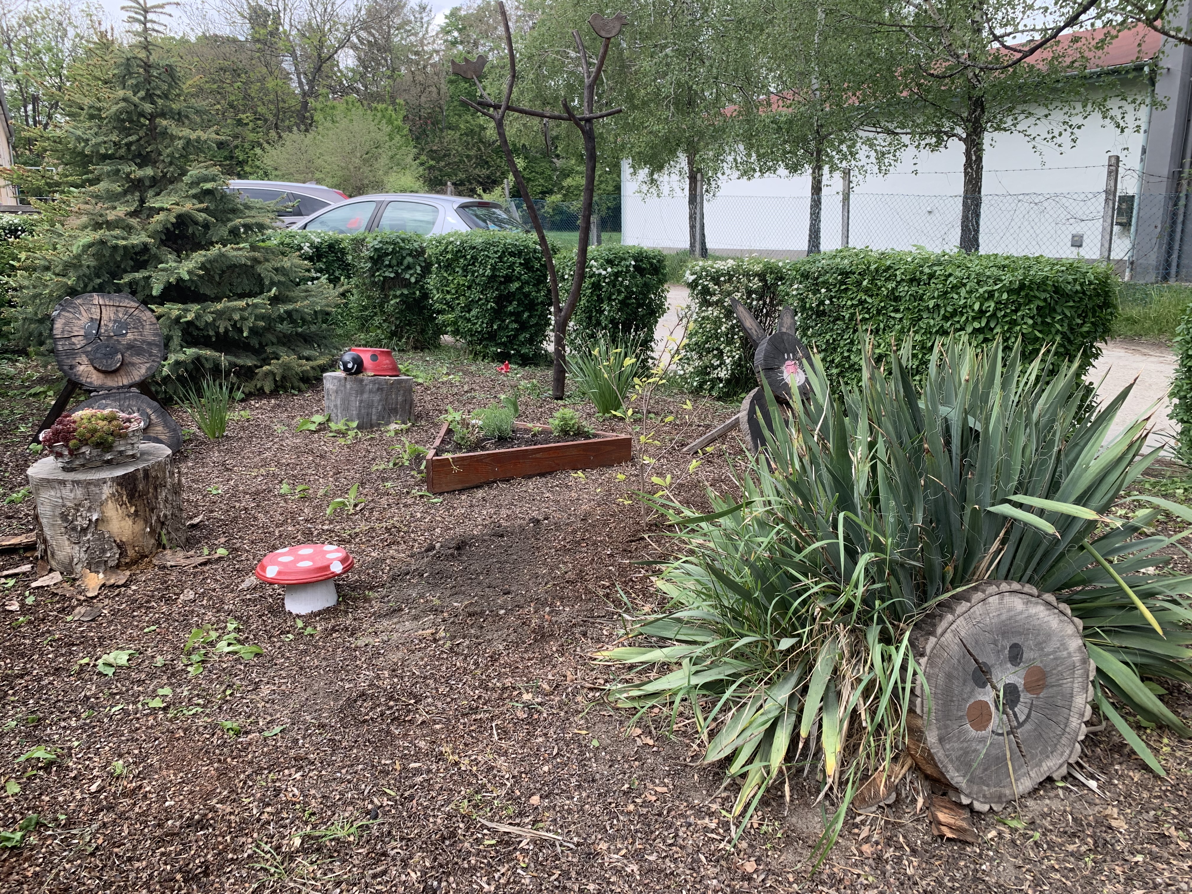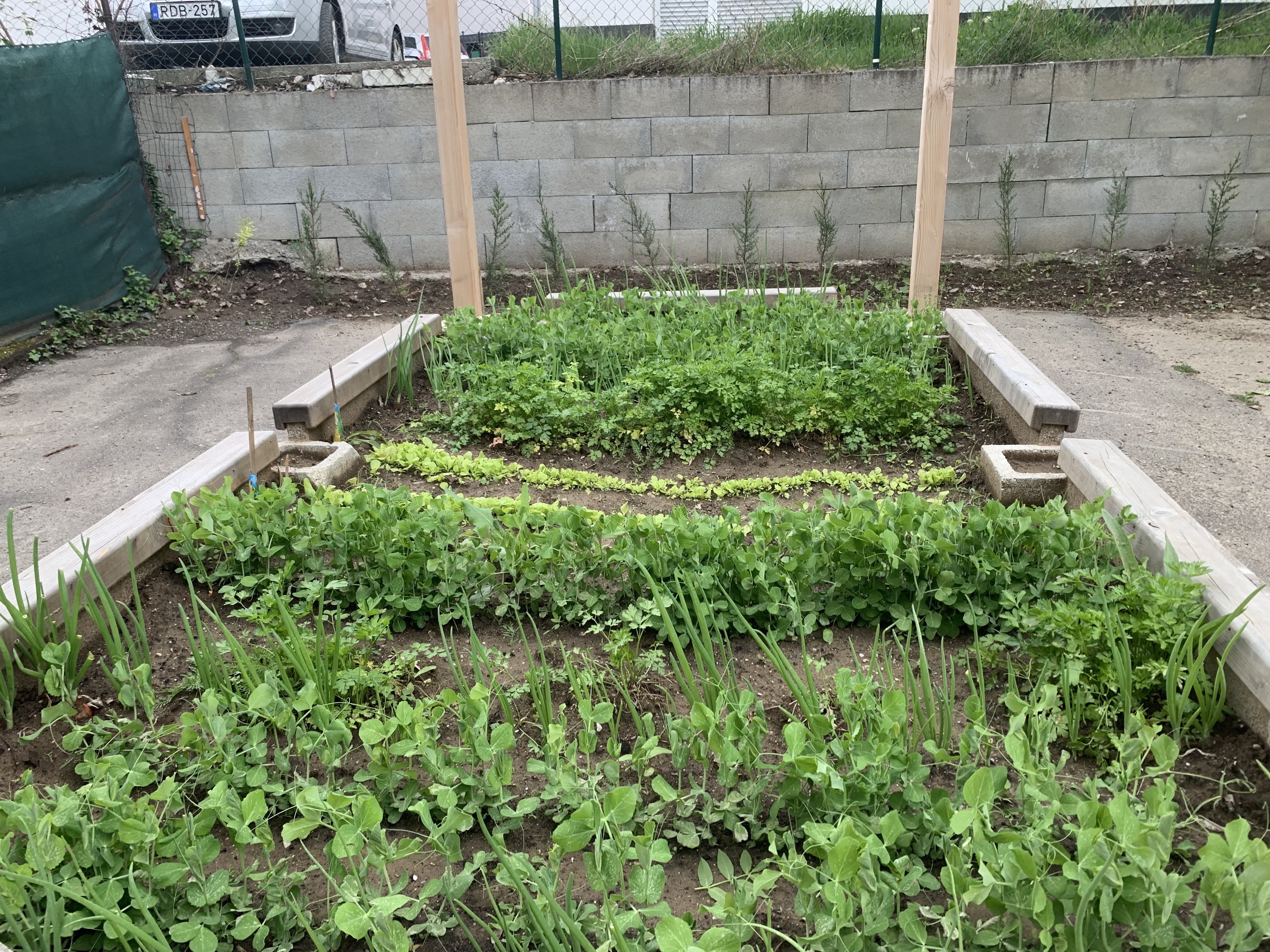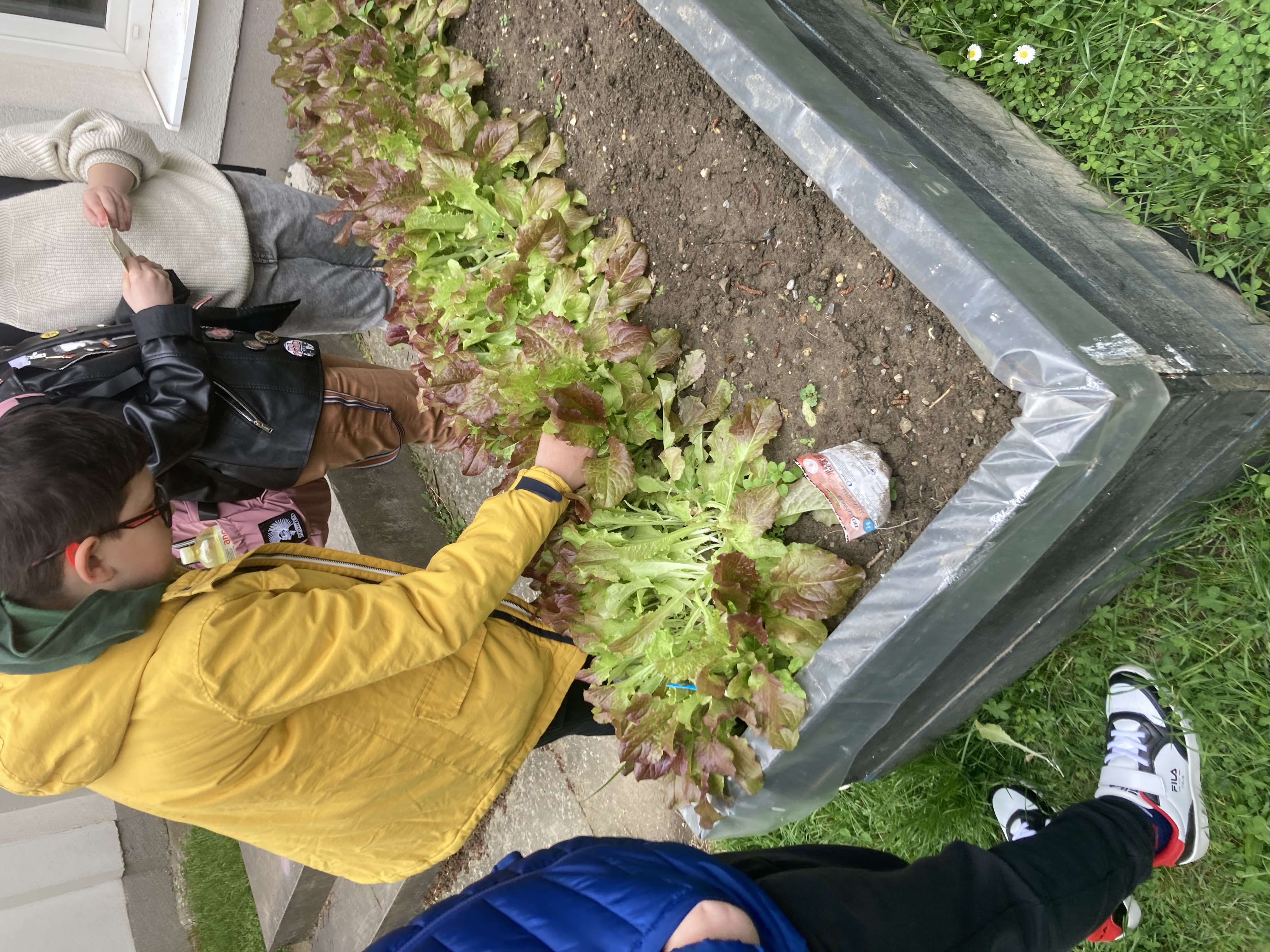 Megnéztük a magaságyásokat és a komposztálót is a kertben, ahol éppen saláta betakarítást végeztek a gyerekek, amiből aztán ebéd lett. Többen közülük abbana szerencsében volt részük egy évvel ezelőtt, hogy személyesen találkozhattak Dr. Jane-nel Veszprémben. A találkozó nagy hatással volt rájuk is.