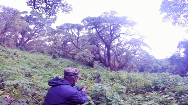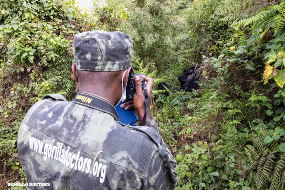 Dr. Gaspard egy Nikon DSLR fényképezőgéppel végzi az állapot megfigyelés alapján történő felmérését. Hirwa csoport, 2022. július. Fotó © Will Wilson a Gorilla Doktorok számára