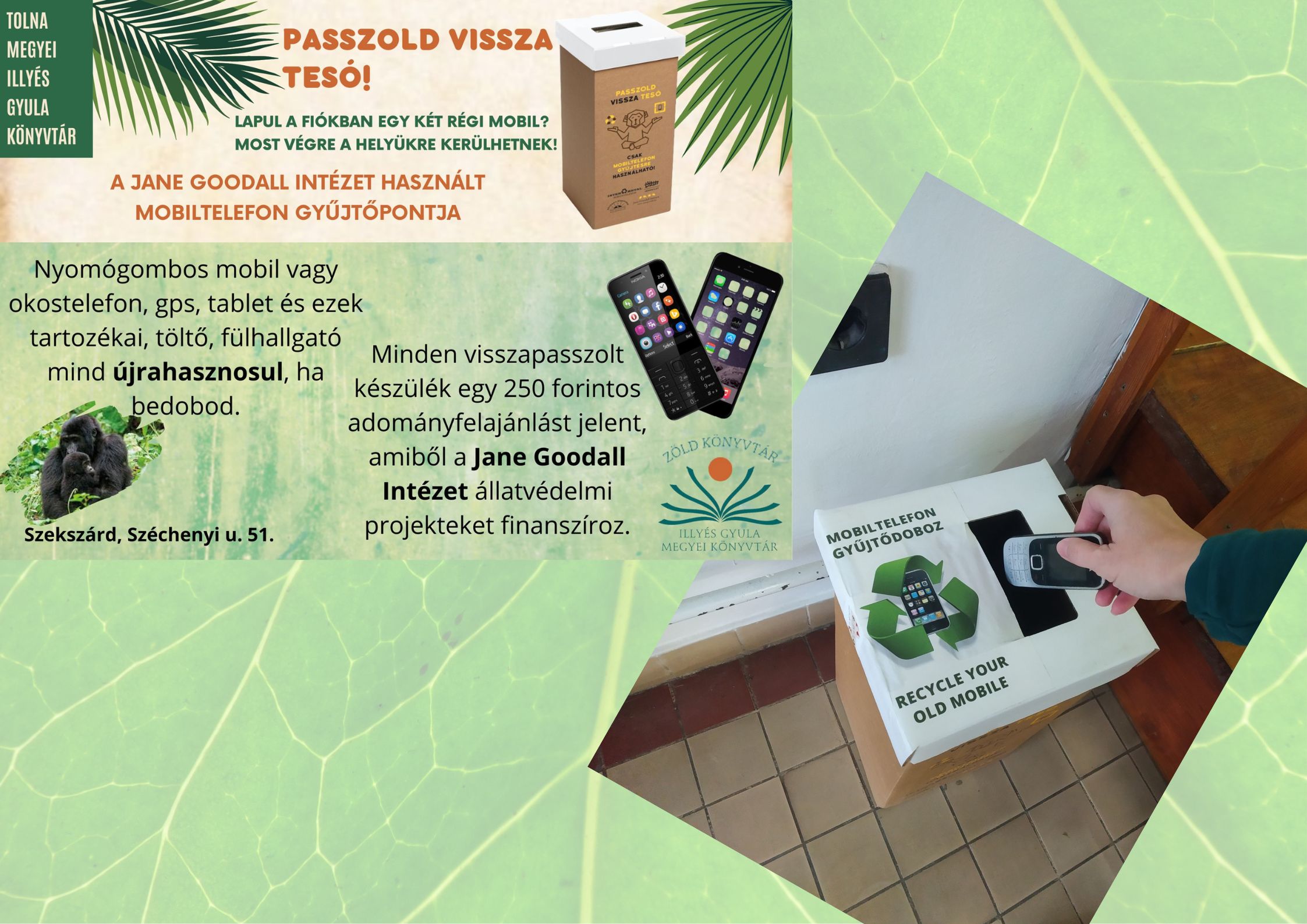 Az öko csoport tagjaiként részt vettünk a GreenDependent és az E.ON által létrehozott EnergiaKözösségek energiamegtakarítási versenyben, ahol harmadik helyen végeztünk. A verseny révén kapcsolódtunk be egy új projektbe. Idén Alsómocsoládon szervezik az Aktív családi nap a „Hét Patak Gyöngye Natúrparkban”-t, ahová mi is kivonulunk különböző szemléletformáló játékos programokkal, amelyeket a későbbiekben szeretnénk több kistelepülésre is elvinni. 2022.04.21-22. között kétnapos zöldkönyvtári találkozó zajlott az Illyés Gyula Megyei Könyvtár, és a Europe Direct Tolna szervezésében. Célunk a hazai zöldkönyvtárakat átfogó hálózat kialakítása. A zöldkönyvtári programokról és fejleményekről honlapunk egy külön oldalán tájékoztatjuk olvasóinkat. Eseményeink követhetőségében állandó web2-es jelenlétünk nagyon fontos, ebben segít, hogy ZöldSzerda címmel minden hónap második szerdáján új tartalmat teszünk közzé. A gyerekkönyvtárunk sajnos külön épületben van, de ott is vannak lelkes kollégák, akik mindenféle programmal csalogatják a gyerkőcöket/fiatalokat. Gyakran hívnak zöld témában előadókat, környezeti neveléssel foglalkozó szakembereket. Kisiskolások számára jött létre a Madárbarát Könyvtári Kör. Természetvédelmi témájú csoportos foglalkozásokat szerveznek általános iskolásoknak és a város óvodásainak. A tárgykészítő foglalkozásokon természetesen mindig újrahasznosított anyagokat használnak az alkotáshoz. Ugyancsak újrahasznosított anyagokból vannak társas-, és egyéb készségfejlesztő játékaik. A könyvtár állatbarát arculatát erősíti, hogy a korábban kóbor életet élő Sári cica, az olvasók kedvence, a főépületet választotta otthonául három évvel ezelőtt. A Gyermekkönyvtárban pedig tavaly nyár óta nevelgetnek két nagyon boldog afrikai óriáscsigát: Gutenberget és Kopernikuszt, akik a zöld témájú gyerekkönyv-kiemelés mellett laknak.