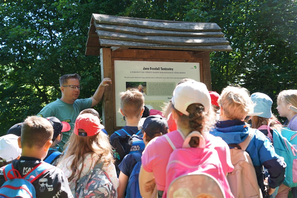 Május 14-én Mocsári Vazul (DINPI) vezetésével és a Julianna Református Általános Iskola második osztályos diákjaival tettünk egy túrát a Jane Goodall tanösvényen. A gyerekek már ismerték Jane Goodall kalandos életét, arcképét rögtön felismerték az információs táblán.