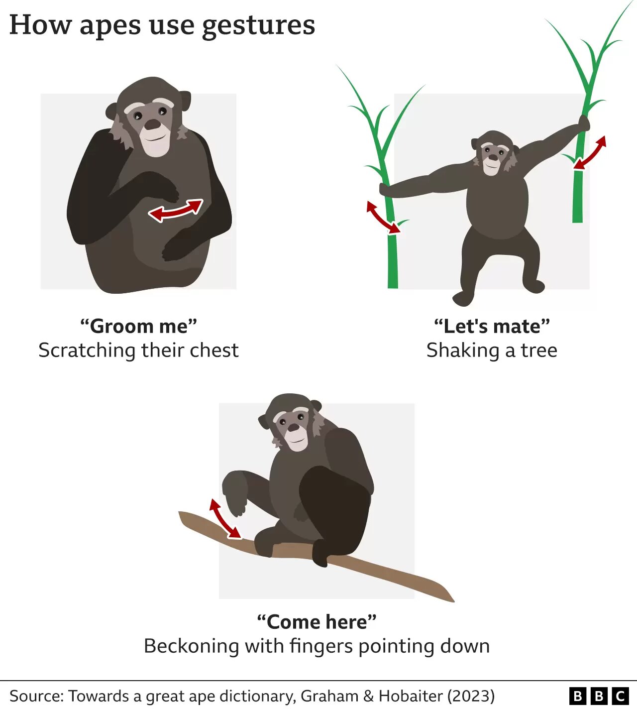 A „tisztogasd meg a bundám” üzenetet elnyújtott vakaró mozdulat közvetíti; a másik szájának simogatása azt jelenti, „add ide azt az ételt”, míg amikor egy csimpánz csíkokat tépdes ki egy falevélből a fogával, az egy flörtölési gesztus.