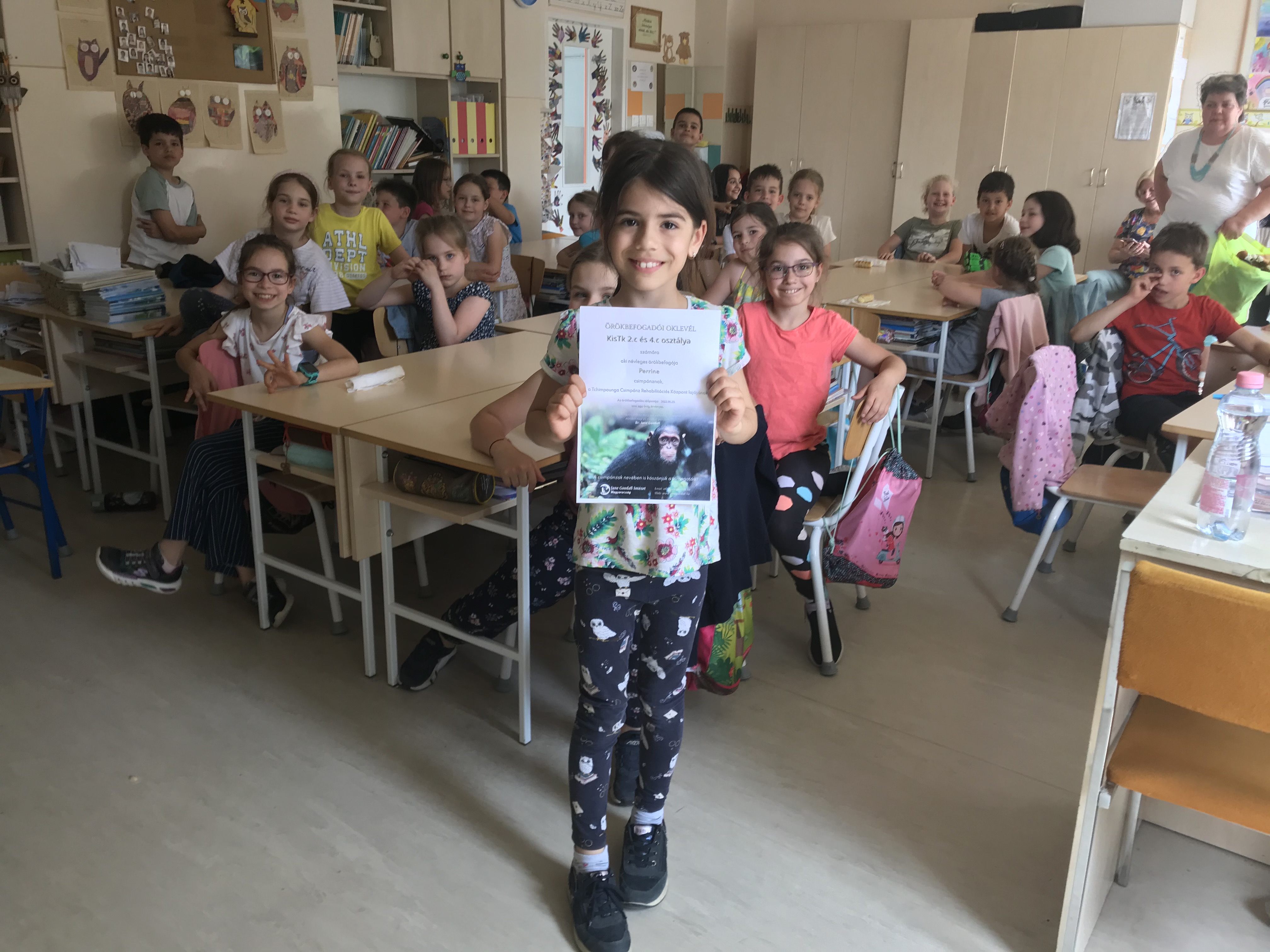 Eszter átadta a gyerekeknek az örökbefogadásról szóló oklevelet. Mindenki kapott egy kis plüss majmocskát emlékbe, amit haza is vihettek.