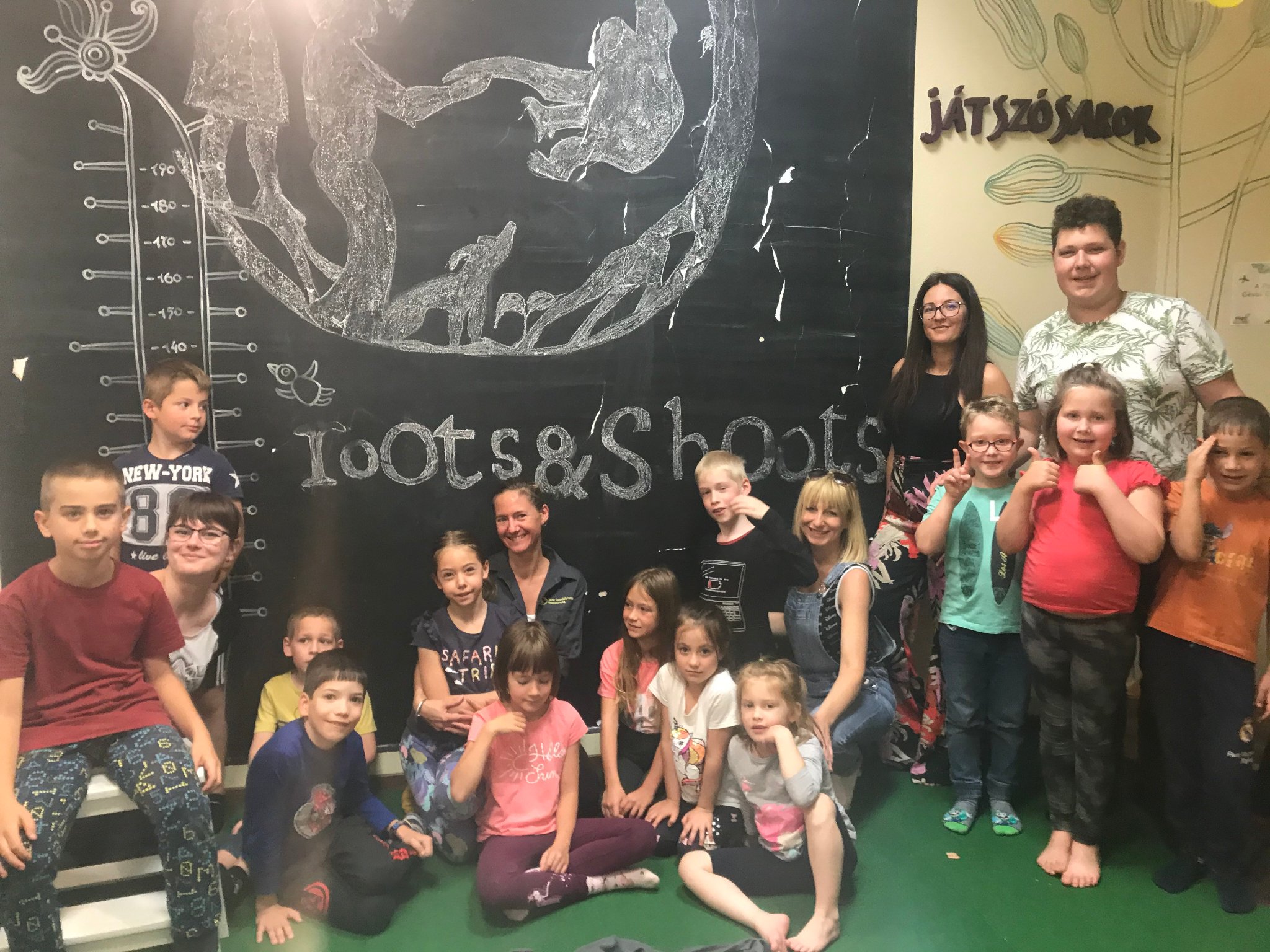 Júliusban a Debreceni Pagony Roots&Shoots csoportunk nyári táborában tartottuk előadást Jane életéről, a csimpánzokról, a Tchimpounga Chimpanzee Rehabilitation Center -ről, és a Jane Goodall's Roots & Shoots Global - ról. Meglepetésként a logónkat felrajzolták a falra, óriás méretben.