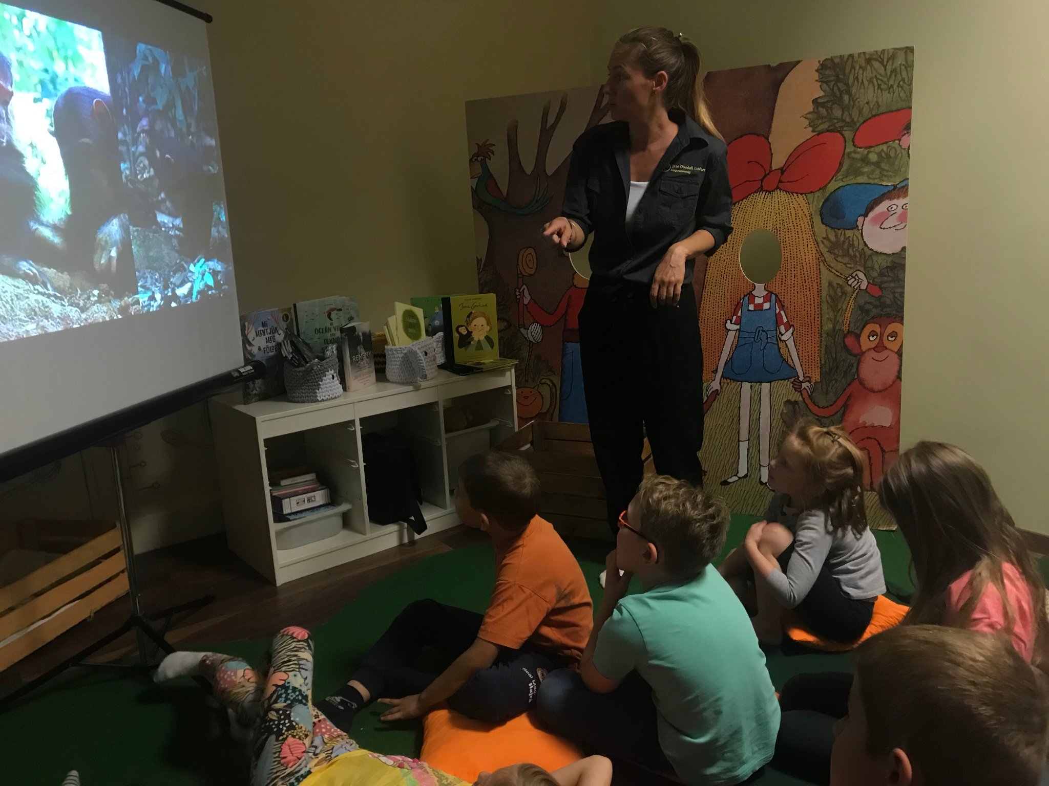 Tegnap délelőtt pedig ellátogattunk a Rex Kutyaotthon Alapítvány Vadállatok szigete táborába előadást tartani a csimpánzokról, Jane életéről, a Jane Goodall's Roots & Shoots Global -ról, és az öntevékeny környezetvédelem fontosságáról. Nagyon érdeklődő, közreműködő gyerekekkel találkoztunk, és hamar kiderült, hogy vannak olyan okosak, mint egy csimpánz.