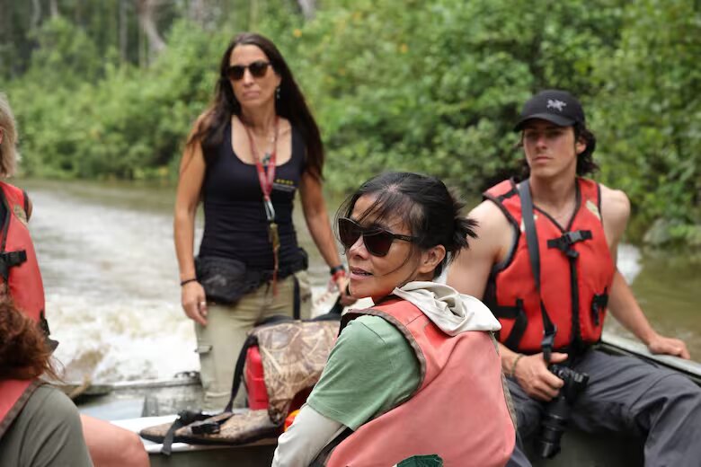 A háttérben Rebeca Atencia primatológus, a Tchimpounga menhely „alma mater”-e. Előtérben Bella Lam a kanadai Jane Goodall Intézet vezetője.