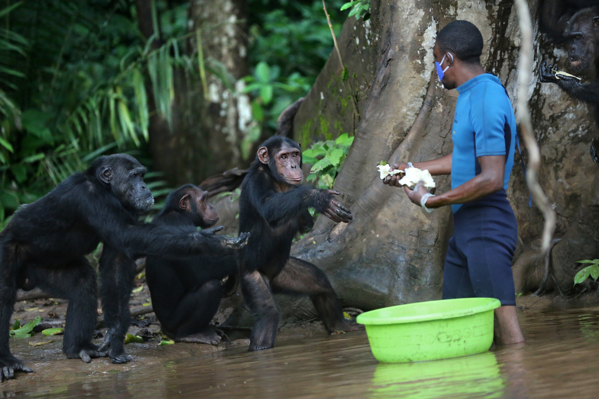 Mentett csimpánzok táplálása, akik a Tchimpounga menhely szigetein élnek