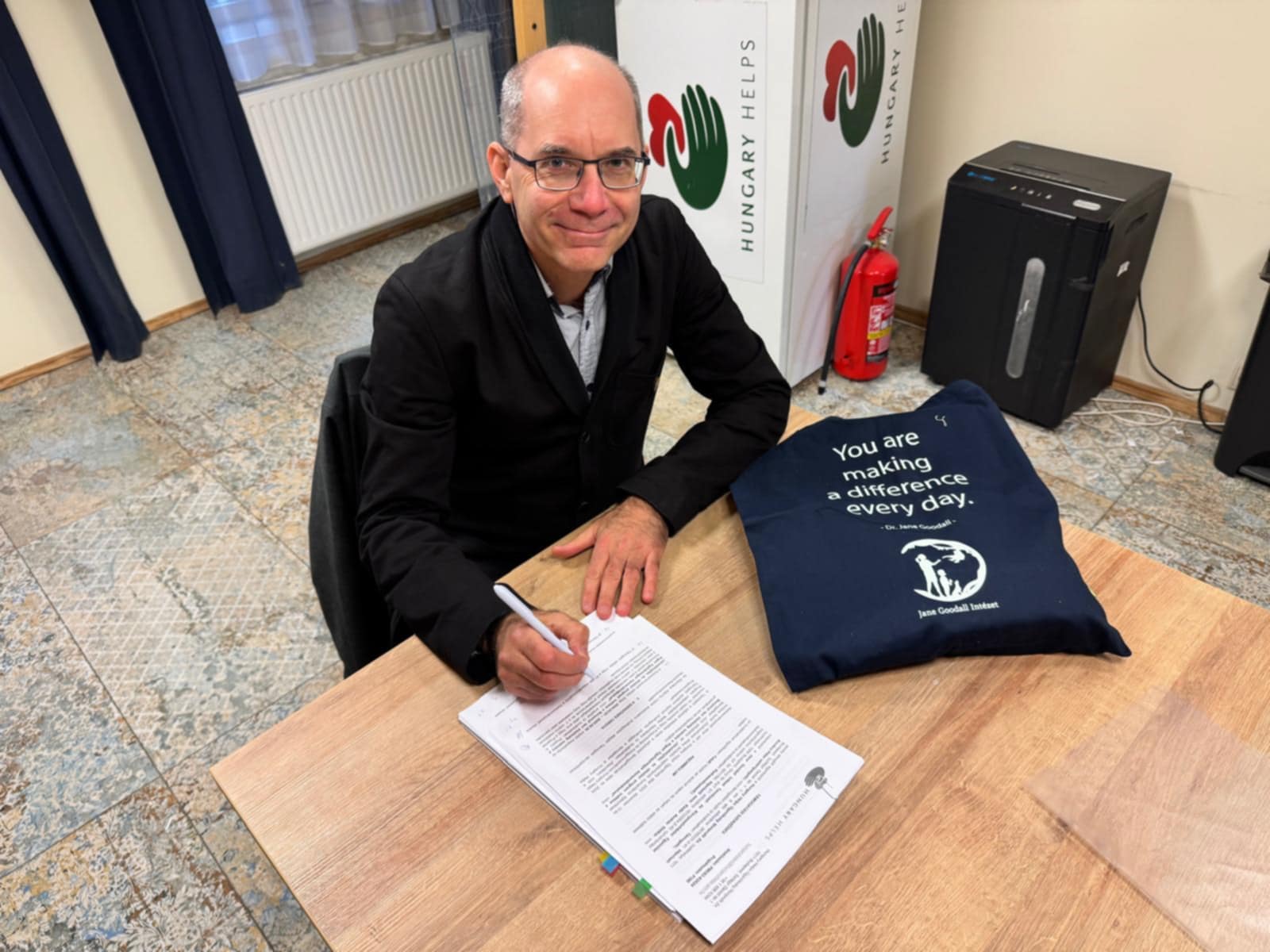 A jövőbe, és a reménybe tekintve: A képen András aláírja a Hungary Helps Ügynökség 2025 évi támogatását, ami az ugandai projekt folytatásához nyújt segítséget.