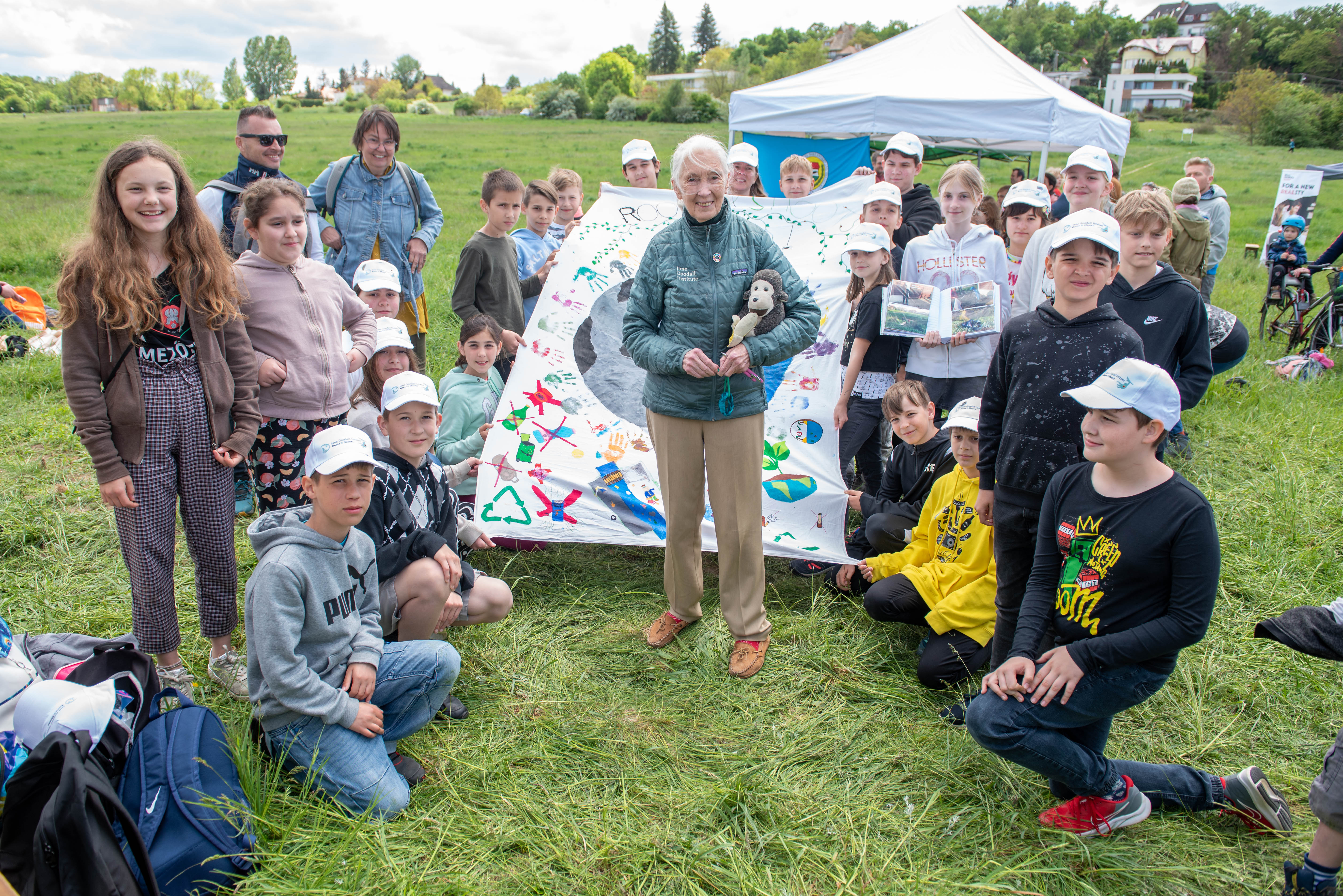 Izgatottan vártuk május 9-ét,ahol személyesen találkozhattunk vele. A rendezvény helyszíne a Hármashatárhegyi repülőtér volt, amely mellett a Jane Goodall tanösvény is van. Mocsári Vazul vezetésével végigmentünk a tanösvényen. Közben mesélt nekünk arról, hogy pár évvel ezelőtt Jane elengedett itt pár haragos siklót, amely fokozottan védett állat. Mesélt még az ürgékkel és más ott élő élőlényekkel kapcsolatos tudnivalókat, történeteket. A túra után hamarosan megérkezett a helyszínre Dr. Jane is, aki egy rövid beszédet mondott, amelyben a csimpánzokról és a környezetünk védelméről volt szó. Ezt követően minden csapathoz külön odament és meghallgatta, hogy mit tesznek ők személyesen a környezet védelmében.