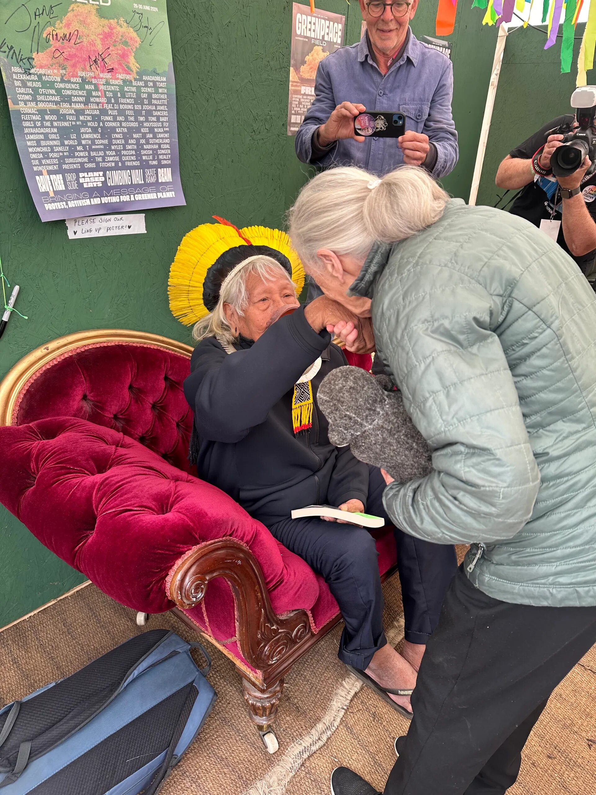 Később a környezetvédő lehetőséget kapott arra, hogy találkozzon Raoni Metuktire főnökkel, egy brazil őslakos vezetővel, aki szintén szerepelt az idei Glastonbury programban. " Ő volt a leglenyűgözőbb ember, akivel találkoztam" – mondja – "Ott volt, és támogatást kért az őslakos népnek az illegális fakitermelés, az aranybányászat, valamint a földek elkobzása elleni küzdelméhez."