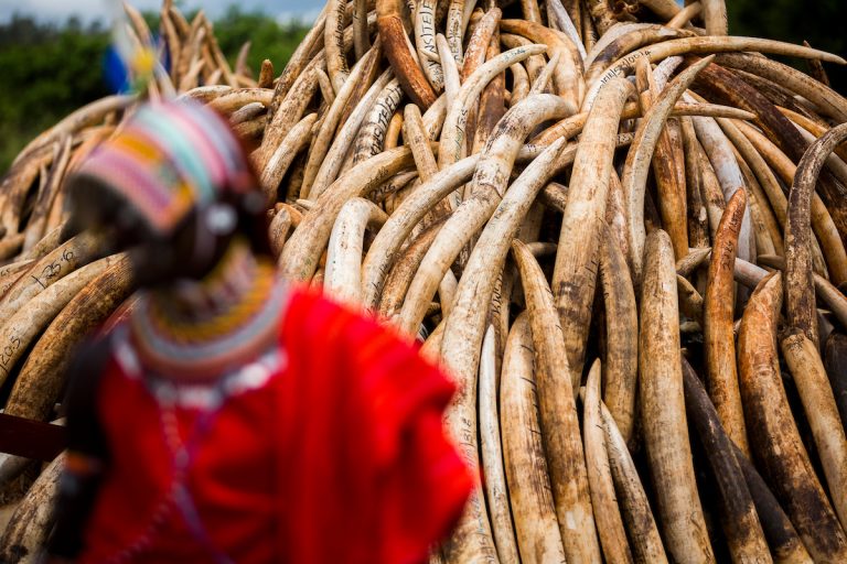Egy halom agyar vár megsemmisítésre Kenyában. A mintegy 8000 elefántból származó agyar több mint 105 millió dollárt érne a feketepiacon. A természetvédők attól tartanak, hogy az elefántcsont illegális kereskedelméből finanszírozott orvvadászat miatt fennáll a valós veszélye annak, hogy az elefántok a következő 50 évben kihalnak. Fotó: N: Paul Hilton